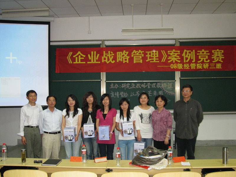 “2009年研究生战略管理课程案例分析竞赛”在李庆华老师的精心筹备和大力支持下于5月18日成功举办,此次竞赛以“深入学习和落实科学发展观”为宗旨,力图科学运用“科学发展观的思想”来提高我校“研究生战略管理课程”的教学水平,本次竞赛把课堂中的理论知识与企业管理实践有效地结合了起来,为广大研究生同学提供了一个与企业界专家面对面交流的机会和平台,加快了建设我校研究生《企业战略管理》精品课程的步伐。