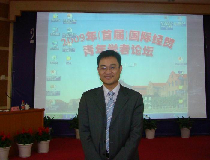 图为邱斌教授在2009(首届)国际经贸青年学者论坛做演讲