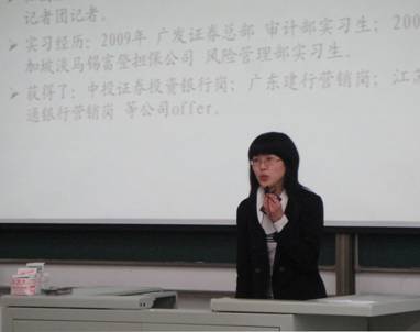 第一位嘉宾是来自于管理科学与工程专业的陈慧丽,目前她已经与华泰证券股份有限公司总部签约,岗位为投资研究。陈慧丽通过自己在实习和求职过程中的一些小故事和师弟师妹们分享了自己的求职体会和感悟。她认为:不管是寻找实习还是正式求职之前,都要明确自己的兴趣所在,有的放矢地去准备将会有更大的收获;面试前做好充分的准备,包括对应聘公司的了解、面试官可能提出的问题等,将会更有利于自己在面试中脱颖而出。谈到现在很多公司都会采用的,同时也是很多应聘者比较没法把握的一种面试方式——群面的时候,陈慧丽给出了自己的经验之谈:由于群面中很多人都希望自己能表现出色,但却更容易陷入争执不下的局面中,反而不利于自己和团队的整体表现,所以大家不一定要表现的很强势或者非要有独树一帜,重要的是要能在关键时候提出有助于解决问题的建议;要尊重同组的竞争对手,可以对他们的观点先表扬再提出自己的观点;表述的逻辑性也是非常重要的一点。同时,陈慧丽还针对压力面试中可能遇到的状况提出了自己的看法:由于面试官只是想了解应试者在压力下是如何处理问题的,所以即使回答不上面试官的问题也不必过于担心,更不能胡乱编造一通,那样只会让结果适得其反。