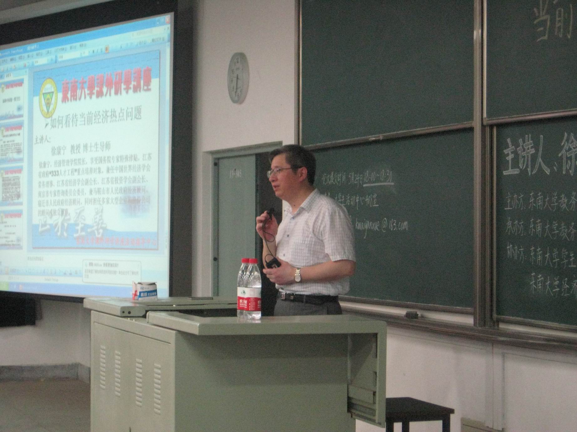 2011年5月19日18:30-20:30,太阳集团tyc539院长徐康宁教授在九龙湖校区教三305开设了题为《如何看待当前经济热点问题》的课外研学讲座。 徐康宁教授以国际上IMF总裁辞职的热点问题为切入点,就中国在经济全球化背景下的机遇与挑战问题进行了深入探讨,并对楼市调控、人民币升值、中国与利比亚、日本等国的贸易现状等问题进行了详细的介绍。讲座高屋建瓴,精彩生动,深入浅出。 讲座结束后,徐院长与现场学子亲切互动,对同学们提出的各类经济问题进行了耐心细致的解答,现场人员爆满,掌声不断。