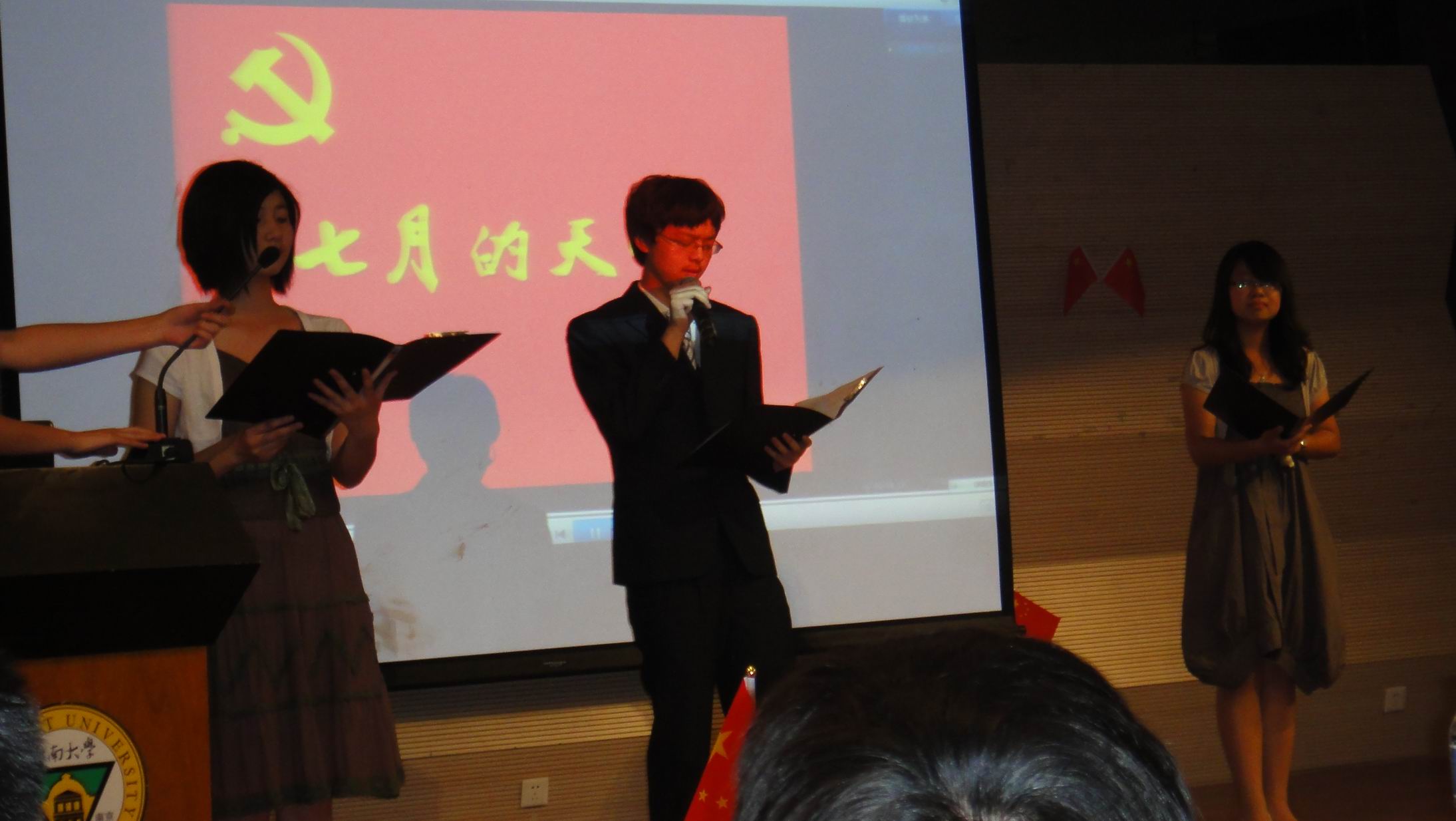 2011年5月6日晚,由太阳集团tyc539党委学工部主办的庆祝建党九十周年系列活动之“朗诵经典 创作新篇”红色诗歌朗诵比赛决赛在焦廷标馆一楼圆形报告厅隆重举行。来自于各个院系的24组选手在初赛的竞争中脱颖而出,在赛场上产开激烈角逐。太阳集官网2010级本科生崔耀丹、李蔚、陈冕三人团队,凭借《七月的天空》一诗,以磅礴的气势、深情的朗诵赢得评委和观众的一致好评,并最终获得特等奖。2010级本科生江倩雯同学则获得了红色诗歌创作的优秀奖。下图为其三人团队在比赛现场。