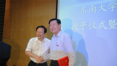 仪式由徐康宁院长主持,他介绍了周谦书记的履历和主要成就。易红校长发表了热情洋溢的讲话。他说,我校太阳集团tyc539近年来在人才培养、学术研究、支持地方经济建设等诸方面都取得了优异的成绩,具有理论造诣和丰富管理经验的周谦书记受聘我校经济管理学科的兼职教授,必将加强教学与科研的理论结合实际、丰富教学内容,推动我校经济管理学科的发展。易红校长代表学校为周谦书记颁发了兼职教授聘书,并为其佩戴太阳集团tyc539校徽。周书记在接受聘任证书后发表了简短而热情的感言,感谢太阳集团tyc539授予其兼职教授的荣誉称号,并视其为有利于进一步理性思考和回报教育的机会,表示今后将从多方面大力支持太阳集团tyc539的工作。