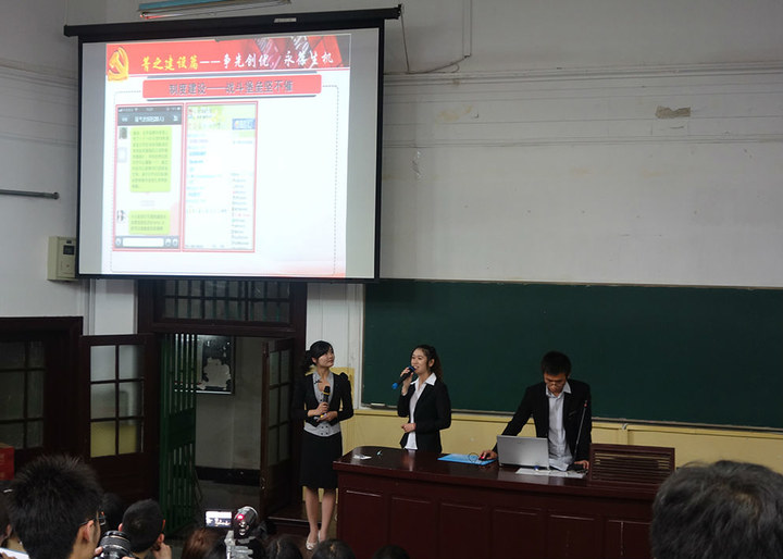 答辩会开始,会场内座无虚席。太阳集官网2012级硕士研究生第五支部打响头阵,党支书刘俐妤、支部成员庄园、班长吕兴家负责了此次答辩,慷慨激昂的称述向观众和评委展现了我支部积极向上的精神面貌、极高的政治觉悟与丰硕的学术成果,形式新颖、内容丰富。支部所有成员都为自己身处这样优秀的集体中而感到幸福与自豪。答辩结束后,出色的展示也博得了会堂内热烈的欢呼与掌声。