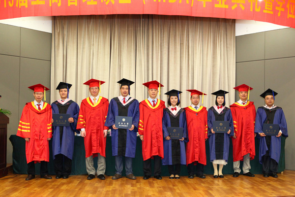 郭彤主任宣读了关于《授予2013届工商管理硕士(MBA)常国刚等170位同学工商管理硕士(MBA)学位》的决定。沈副校长、徐院长、熊副院长、何副院长、李副院长共同为获得工商管理硕士(MBA)学位的毕业生们拨流苏、颁发学位证书,并合影留念。
