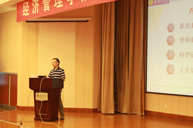 经管学院院长徐康宁教授就“关于提升学术水平的几点思考”作了主题发言。徐院长分别从成就与压力、学术水平是真正核心竞争力以及进一步提升学术水平的设想和措施等三个方面作了详尽的阐述。他鼓励各位老师满怀对学术的热情,执着地追求各自的学术梦想。
