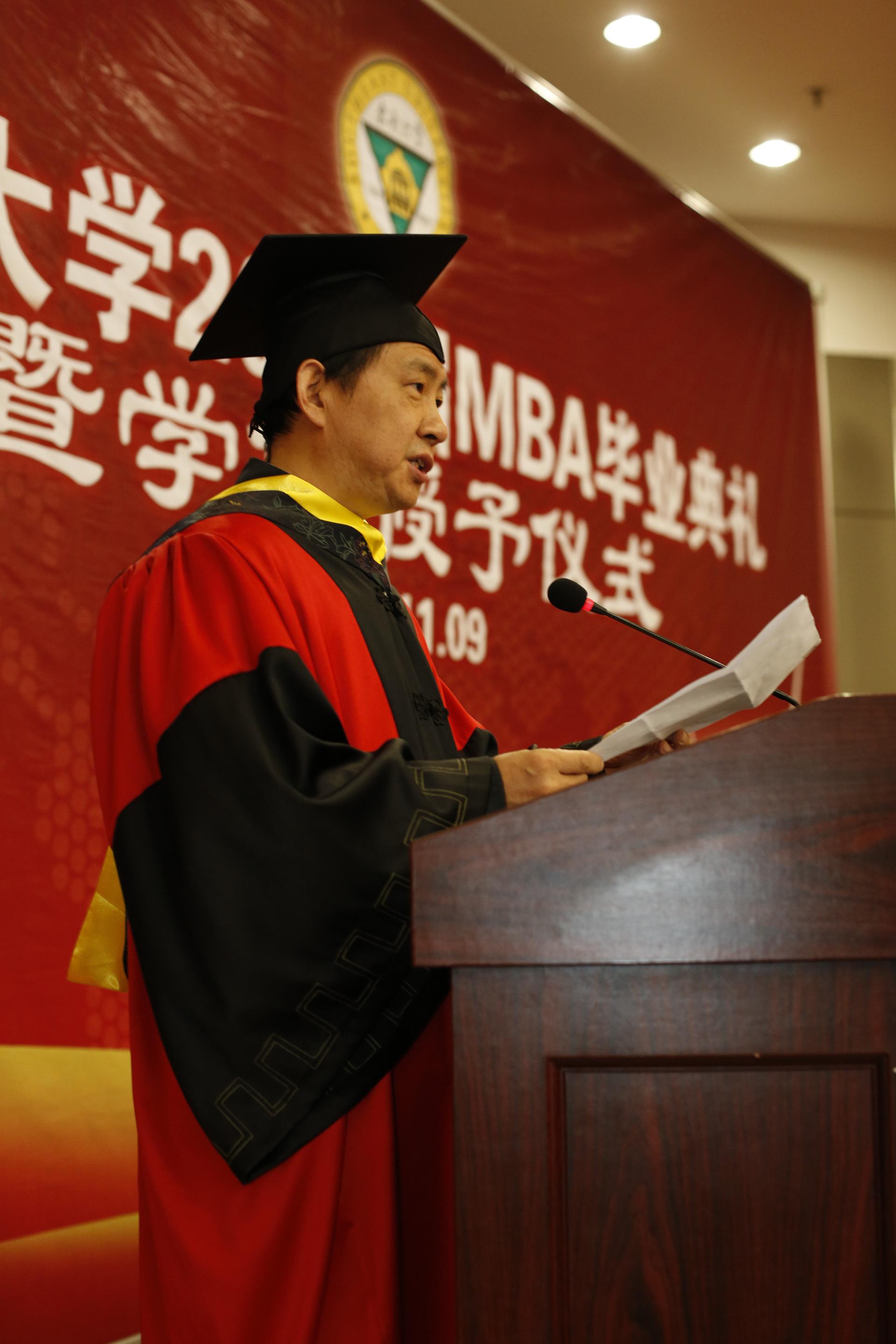 毕业典礼暨学位授予仪式由李东副院长主持,徐康宁院长首先致辞。徐院长向获得工商管理硕士(MBA)学位的146位同学表示热烈的祝贺,对同学们在校期间笃学不倦、砥砺品学的学习态度予以充分肯定。徐院长指出,当前中国经济飞速发展蕴含着大量的机遇与挑战,他希望同学们珍惜机遇,志存高远,以创新精神迎接时代的挑战,在不断追求中成就璀璨的人生。徐院长诚挚地勉励同学们把所学知识用于实践之中,学以致用,学用相长,并在实践中发现新知、运用真知,在解决实际问题的过程中增长才干。徐院长深情地寄语同学们:老师们翘首以待你们捷报频传,期待着你们在新的征途中大展鸿图、再创佳绩。