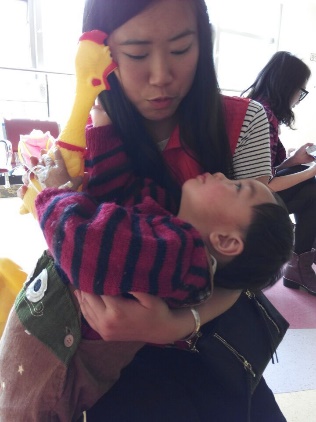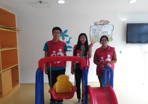 当志愿者刚刚打开活动室的门的时候就有家长带小孩子进来玩,不知不觉地,活动室的孩子也逐渐多了起来。开始时大多是家长利用志愿者提供的器械来跟孩子玩,很快志愿者们也用他们的热情参与到活动中来,开始于儿童交谈,哄他们开心。活动室内渐渐充满了笑声。