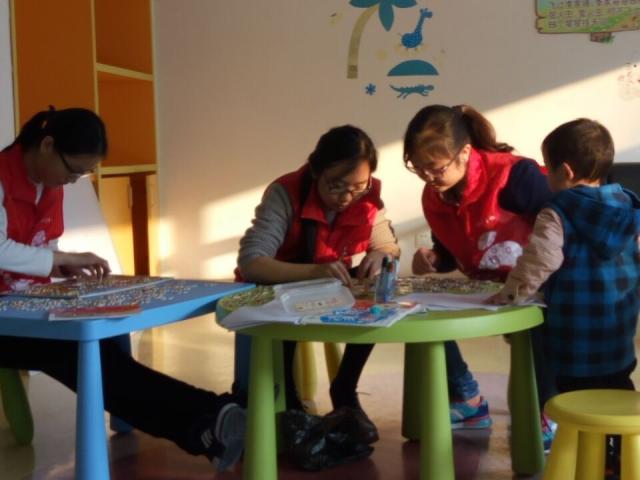 到了下午三点,孩子们陆陆续续从睡梦中醒来,来到活动中心玩耍。那之后的活动就非常热闹了:有的孩子在志愿者陪伴下滑滑梯,有的和志愿者一起拼拼图,还有和志愿者比拼画画的,当然也缺不了害羞地站在一旁用渴望的眼神观看的孩子。不过,害羞的孩子最后都会被志愿者们拉过来一起玩耍的。