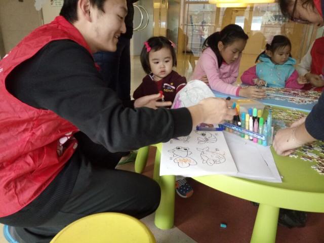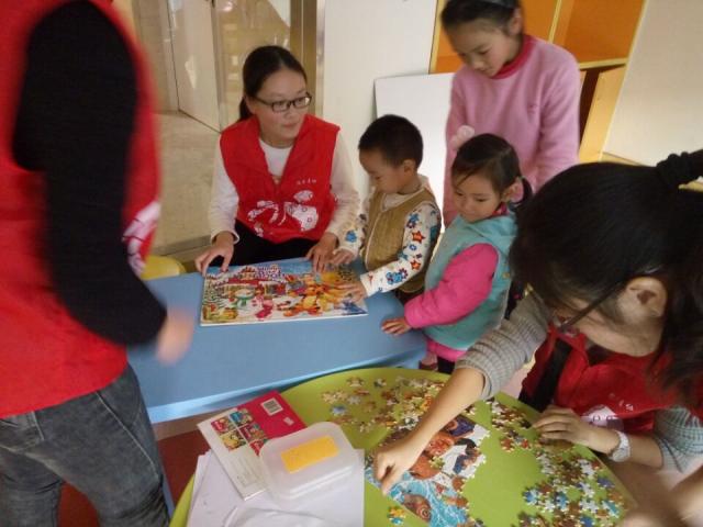 到了下午三点,孩子们陆陆续续从睡梦中醒来,来到活动中心玩耍。那之后的活动就非常热闹了:有的孩子在志愿者陪伴下滑滑梯,有的和志愿者一起拼拼图,还有和志愿者比拼画画的,当然也缺不了害羞地站在一旁用渴望的眼神观看的孩子。不过,害羞的孩子最后都会被志愿者们拉过来一起玩耍的。