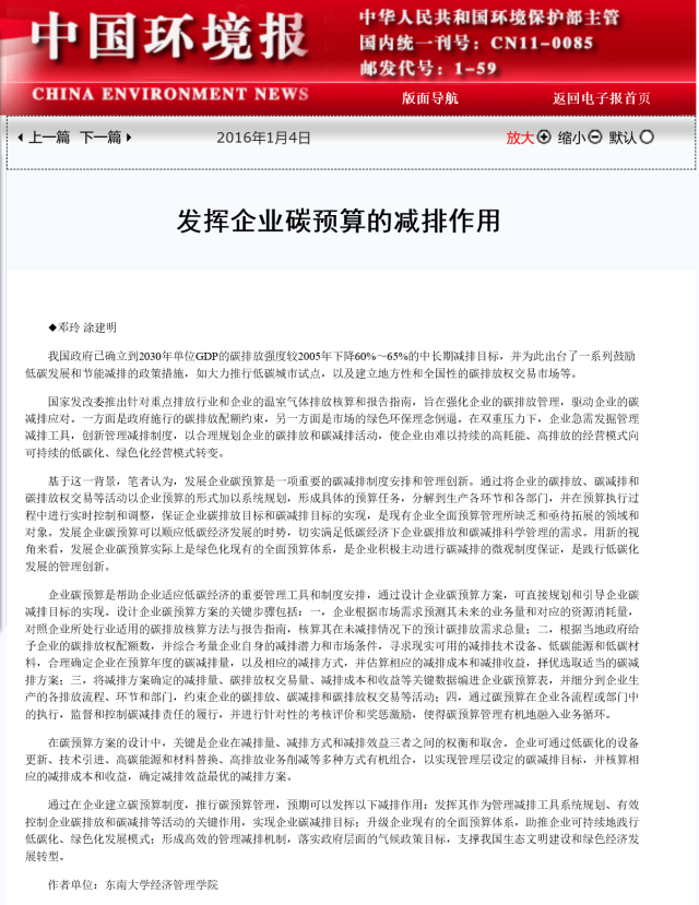 太阳集官网会计学硕士生邓玲以第一作者身份与导师合作撰写的文章《发挥企业碳预算的减排作用》,发表于全国性报刊《中国环境报》(2016年1月4日第2版)。该文章基于国家低碳经济转型和企业碳减排压力的背景,提出将发展企业碳预算作为一项重要管理工具和制度安排,帮助企业提高减排绩效和适应低碳经济发展的要求。文章阐述的企业碳预算发展思路和企业碳预算的减排作用,对于区域与企业减排工作的开展具有启发性。该文迅速被“中国环境网”、“中国大气网”、“中国绿色碳汇基金会”、“低碳工业网”、“中国碳排放交易网”、“中国气候变化信息网”、“中国环境保护产业协会”等20多家网络媒体全文转载。