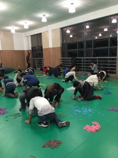 1800,根据知识竞赛的得分高低,参赛小组依次选完了600块骨牌及5个机关,经过5分钟的试摆,大屏幕上60分钟的倒计时启动,选手们正式开始比赛。本次决赛的主题为“为东大做幅画”,经过一个星期的准备,7个小组都已有了自己心中的最美东大,图案设计早已了然于胸,现场摆放自然信手拈来,选手们所需要的,是绝对的专注和淡定的心态,稍有不慎,一牌倾倒,满盘皆输。