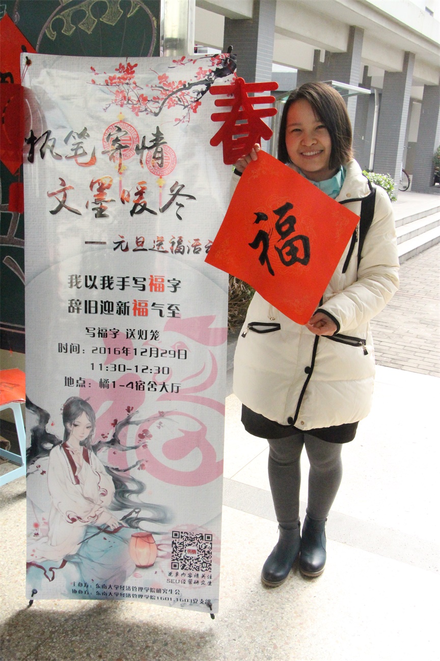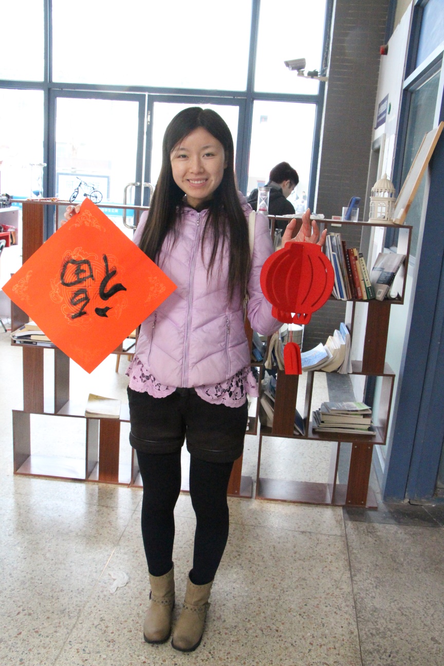 完成福字的同学开心地接过我们的活动小礼品——红灯笼和“春”字的挂饰。