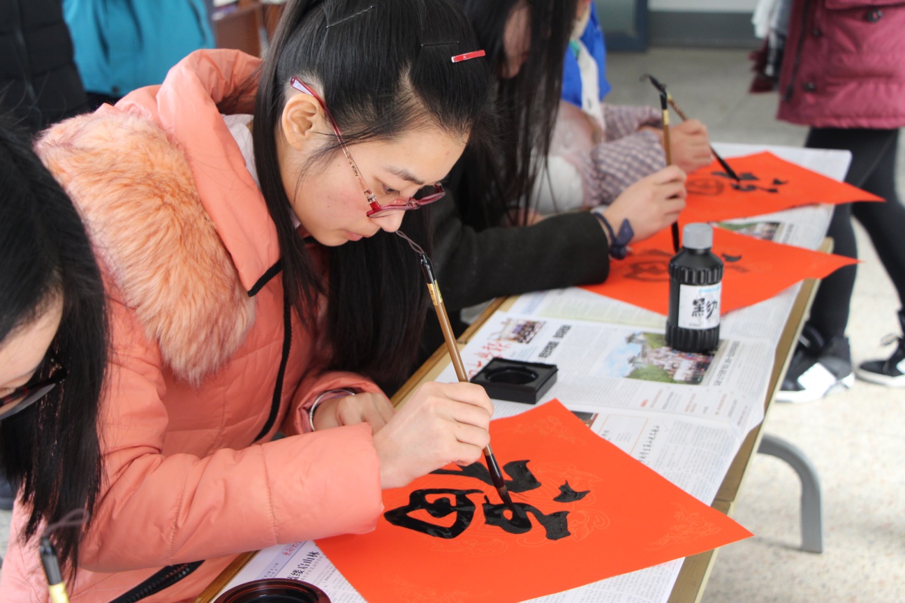 11点许,同学们陆续参加到我们的活动中,拿起毛笔,沾染墨水,提笔在喜庆的红纸上写下寓意良好的“福”字。
