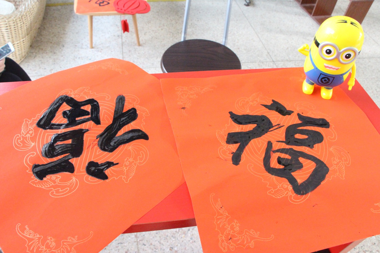 完成福字的同学开心地接过我们的活动小礼品——红灯笼和“春”字的挂饰。