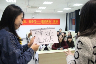 第一个环节是“两会热词你划我猜”,活动时,场上同学“手脚并用”,充分描绘自己看到的词语,场下同学全神贯注,努力猜词回答问题,场面十分热烈。该环节让同学们在轻松幽默的环境下了解今年两会的热点和国家的最新动态。