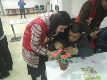 再次见到那些孩子时,并没有过于热络的寒暄,而初次来访的一些志愿者也在渐渐熟悉环境。志愿者们与孩子们一同做完简单的热身活动后,坐在一起,进行一些简单的手工游戏,室内逐渐飘荡起欢声笑语。棉花塞在手工花盆里面充当泥土,将不同颜色的花瓣插在小棍上,再穿上几片叶子,就成了花,花放在花盆里,绘除了五彩斑斓的美景。但是,看似简单的过程,孩子们依然要在志愿者老师的协助下才可以完成,并且,说费九牛二虎之力也不为过,再会这些坚强的孩子们,心中悲喜交加。随后,班长为其中一个孩子举行了生日宴,大家齐唱生日歌,又齐唱《托养之歌》,在进行了简单的互动之后,孩子们一起分享了一个“超级大蛋糕”,所有人脸上都洋溢着幸福的笑容。本次活动渐渐接近尾声,志愿者们在孩子们的欢送下离开,所有人都一如既往期待着下次的再会。