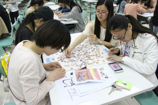 此次活动分为两个部分,包括百科知识竞答和校庆拼图比赛。共有来自各院系的12个小组,48名同学参加比赛,同时,场边还有部分观众参加趣味拼图活动,现场气氛十分热烈。