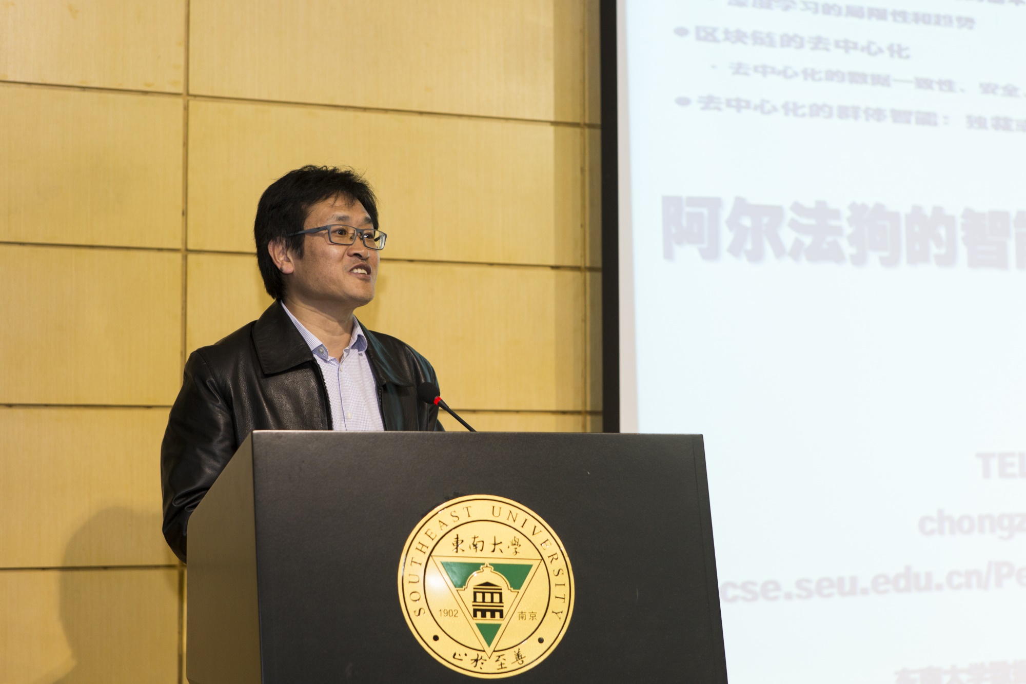 崇志宏教授首先以阿尔法狗为例,深入浅出地为大家介绍了阿尔法狗的智能原理和深度学习的基本方法。崇教授指出,阿尔法狗是弱人工智能,是“旧瓶装新酒”,并提出其深度学习的局限性:感知到认知的困难、符号主义和联结主义的分离、弱人工智能、调试困难、大量的标注数据、学习和推理的分离等等。其次,崇教授讲述了区块链的去中心化。与通常的数据库之间通过通讯传递信息不同,区块链是一个大数据库,它所有的数据都记录在同一个地方,人人都能访问。未来,区块链可应用于物流企业,形成一个超级账本。