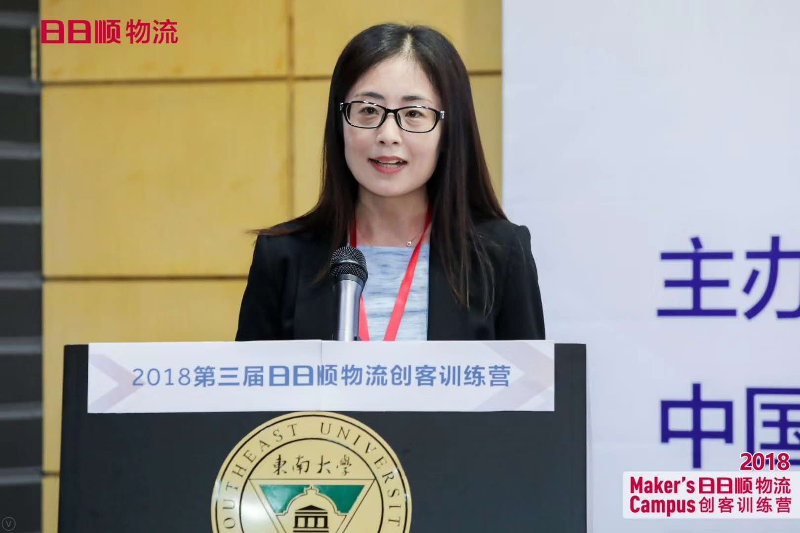 其次,海尔电器集团品牌运营总经理、中国物流学会副会长王梅艳女士代表海尔公司和日日顺物流公司发言。她提到只有了解用户的思维和行业的痛点才能找到解决方案,所以我们想找最具有创新创业精神的大学生,在这个平台上给他们提供更多的孵化可能。希望在座的大学生能一直怀有创客梦想,将梦想落地生根发芽。