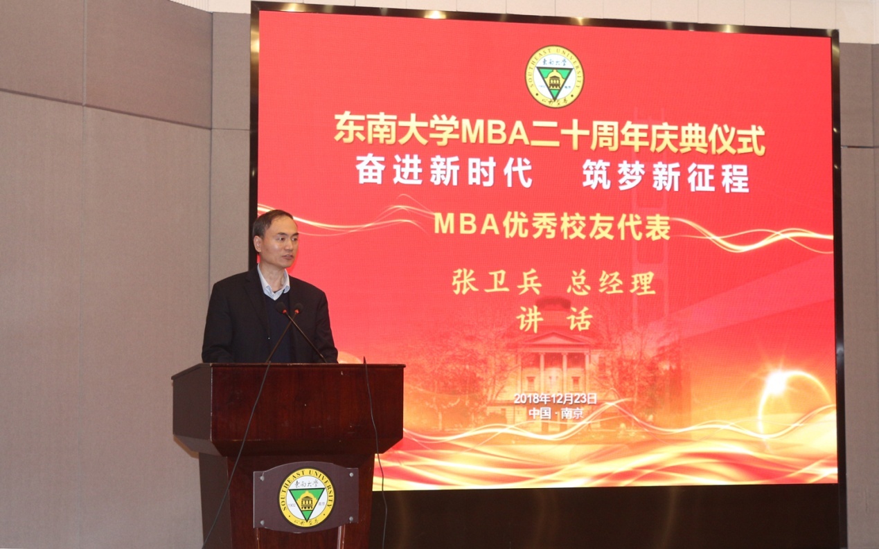 中国核工业华兴建设有限公司总经理张卫兵,代表MBA优秀校友讲话。他感谢母校的培养,感激老师的教诲。他说,正是得益于母校MBA系统学习,让我从一名技术型干部成长为企业重要领导。三年的课堂学习,从管理学到战略管理,从组织行为到人力资源,从市场营销到生产运作等课程,不仅拓展了知识结构,更拓宽了战略眼光,让目标更明确,使视野更开阔。他表示,我们每一位校友一定不辜负母校老师的殷切期望,锐意进取,成就事业,为母校增光添彩。