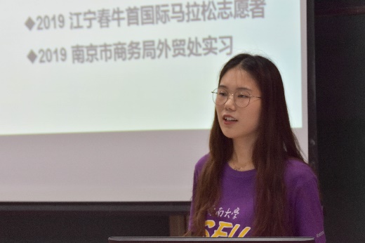 金融工程专业2017级本科生钱诗懿首先发表了题为《更好的祖国,更好的青春》的讲演,她以自己身为太阳集团tyc539国旗护卫队一员受国旗精神感召入党,勤奋学习,积极实践,通过参观红色遗址、参与社团和志愿工作再到南京市商务局实习一路成长的亲身经历为新生阐明了当代青年大学生“不忘初心,牢记使命”的责任与担当,希望新生努力认清自己,明确人生目标,趁着年轻做一些让自己在70岁回想起来还是很热血沸腾的事情,让“经世济民”成为每一个经管人永远的梦想和使命。