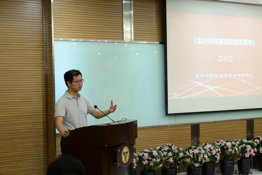 立信中联会计师事务所合伙人江小三老师结合自己的工作实际,作了题为《会计信息披露的相关思考》的报告。江老师针对我国上市公司会计信息披露存在的问题,进行动因分析,谈到了自己的一些独到的见解。他嘱咐同学们一定要做一名坚守底线、合法合规的会计人。