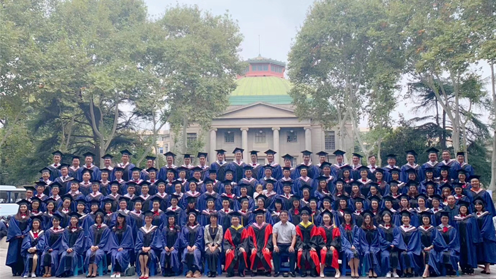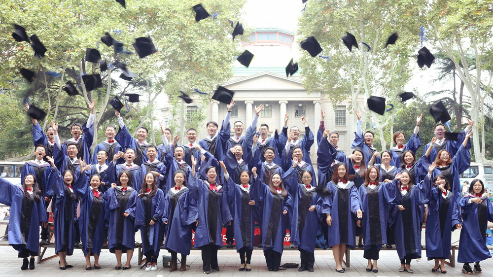 仲伟俊书记、金石副院长、吴在军主任以及吕鸿江副院长,共同为获得工商管理硕士(MBA)学位的毕业生们颁发学位证书、扶正流苏,并合影留念。