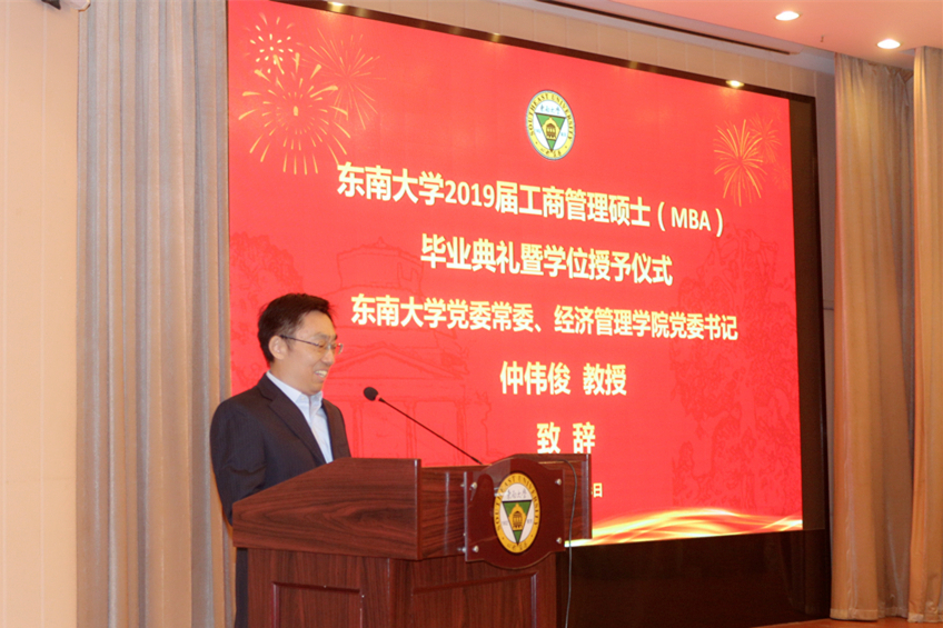 仲伟俊书记发表了热情洋溢的致辞。他首先代表学院全体教职工,向133位荣获工商管理硕士(MBA)学位的同学们表示热烈的祝贺,向默默耕耘的老师们和大力支持的亲属们表示衷心的感谢!仲书记说,2019年是新中国成立70周年,同学们在这么一个年份毕业,预示着你们的30周年毕业庆将与新中国的百年华诞同庆,这是多么有意义的幸运。他说,三年前你们带着憧憬跨入校门,三年的求学生涯,让你们在太阳集团tyc539这个大家庭里收获了成长,今天,你们带着MBA毕业生的新身份和工商管理领域的新知识迈出校门,希望大家始终如一地坚守内心的价值标准,树立有情怀的追求,保持强烈的责任感,摒弃短期的功利,投身更广阔的事业。仲书记真诚地勉励同学们:要将个人的发展融入人类的文明进步和中华民族的伟大复兴之中,让生命不断焕发光彩,无愧于时代,无愧于人生!
