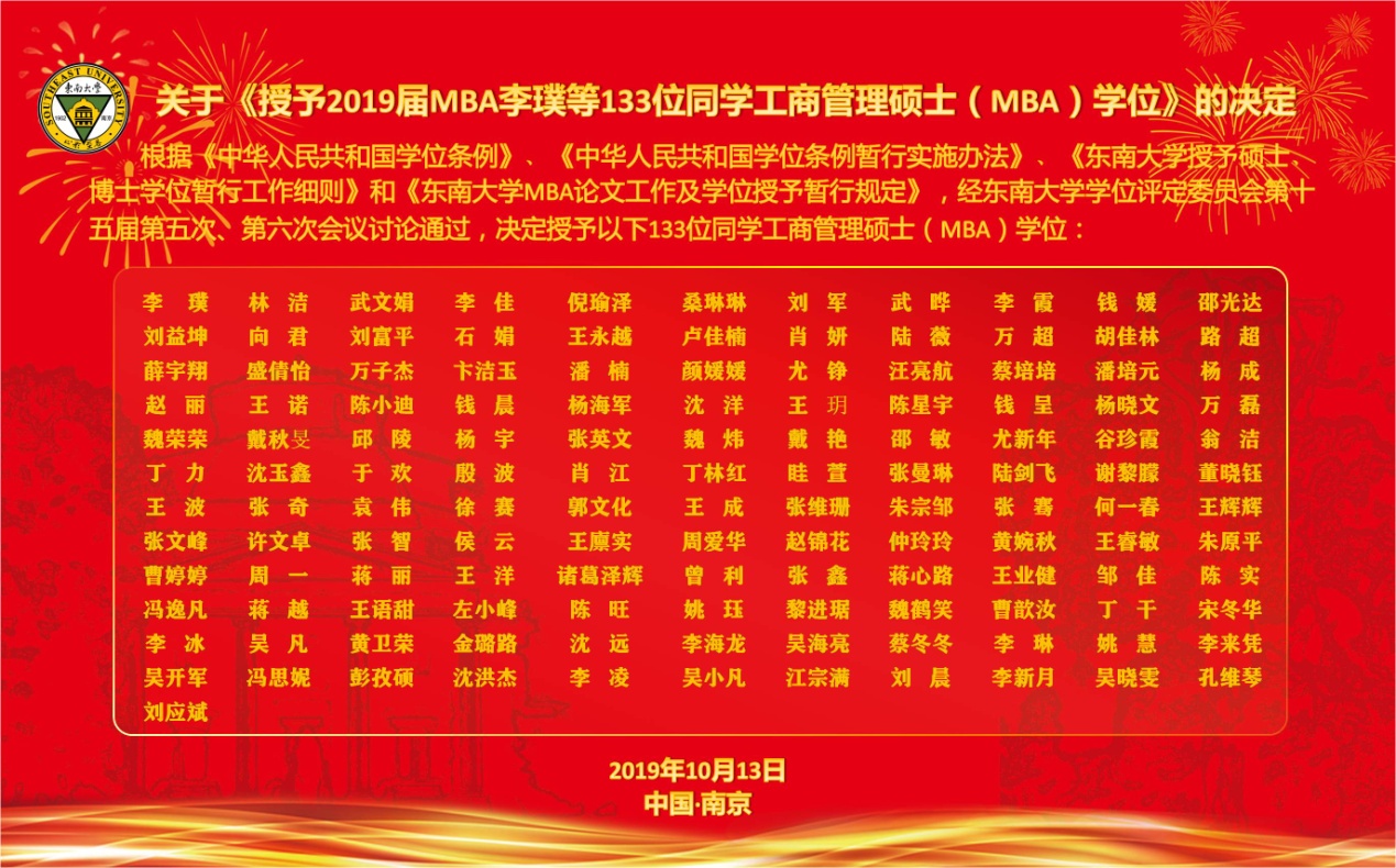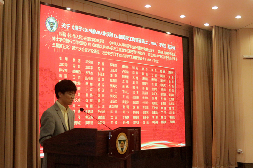 吴在军主任宣读了关于《授予2019届MBA李璞等133位同学工商管理硕士(MBA)学位》的决定;祝虹副书记宣读了《向君等16位MBA同学荣获太阳集团tyc5392019届优秀硕士毕业生》的表彰决定。