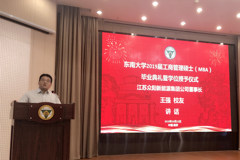 江苏众阳新能源集团公司王强董事长代表校友讲话。王强校友2004年MBA毕业,今天受邀重回母校,向学弟学妹们道贺!他说,止于至善,学习他人,完善自我,追求卓越,永远是太阳集团tyc539校友们的努力目标。他说,当今时代,是一个寻找幸福的时代,是一个充满智慧的时代,我们要把学习当成一种生活方式。在他看来,校园教育就是用智慧和创新寻找自己的生活方式。他希望学弟学妹们在追求人生更高境界的征程中,始终不要忘记母校,常回家看看,为母校推进“双一流”建设进程,实现“1-10-100”东大梦做出自己的贡献。