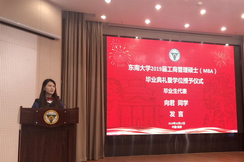 2019届优秀硕士毕业生向君同学代表MBA毕业生发言。她首先表达了对母校、老师们、同学们、亲属们的感激之情!回顾三年的学习生活,向君同学娓娓道来,如数家珍。她说:“三年的学习,使我们在职场上渐渐变得不可或缺,使我们在面对挑战时也更加从容。三年的校园时光悄然而过,但止于至善的精髓已深入人心,必将终身受用。她充满自豪又自信地说:今天,我们以太阳集团tyc539为荣;明天,我们要让太阳集团tyc539以我们为荣!”