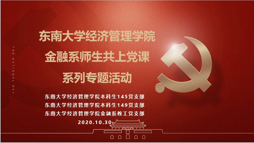2020年5月14日,中共中央政治局常委会会议首次提出“构建国内国际双循环相互促进的新发展格局”。两会期间,习近平总书记再次强调要“逐步形成以国内大循环为主体、国内国际双循环相互促进的新发展格局”。为了宣扬我国脱贫攻坚战的政策,提高党员了解国家金融安全与稳定、“双循环”新发展格局的意识,2020年10月30日,本科生145&149&金融系教工党支部联合开展了金融系师生共上党课系列专题活动,进行了“关于教育脱贫攻坚的专题学习”和“双循环与国家金融安全”的党课学习。金融系教工党支部全体教师和金融系2017级全体本科生党员参与了此次专题活动。