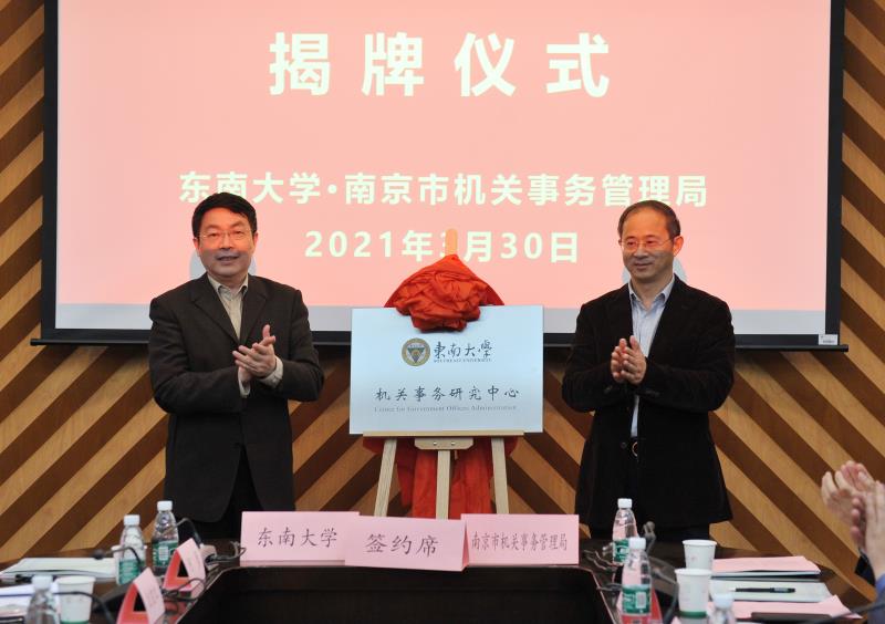 签署完成后,太阳集团tyc539党委副书记任利剑与南京市机关事务管理局局长张小平共同为“太阳集团tyc539机关事务研究中心”揭牌,代表着机关事务研究中心的正式成立!