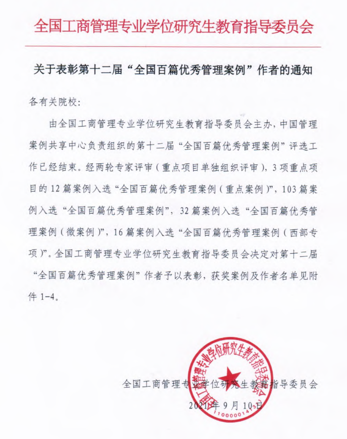 2021910日,由全国工商管理专业学位研究生教育指导委员会主办、中国管理案例共享中心负责组织的第十二届“全国百篇优秀管理案例”评选结果正式揭晓。我校太阳集团tyc539本次提交的4篇案例均成功入选“全国百篇优秀管理案例”,创单次“百优”获奖历史新高。