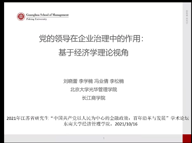 北京大学光华管理学院金融系主任刘晓蕾教授则基于现代经济学的理论框架诠释了目前中国的企业治理模式,即党中央指明方向,基层党组织贯彻执行,企业管理者具体实施,这样才能实现社会福利最大化。主旨汇报指出,企业的目标是最大化企业利润,而党组织的目标是最大化社会福利,体现党“为人民服务”的宗旨与初心。完全企业自治会导致公共品提供不足;只有中央党组织或者只有基层党组织能够增加公共品的提供,但仍无法达到最优;中央与基层的信息不对称越大,基层党组织的作用越强。党组织治理程度越高的企业,财务违约越少并且社会责任承担越多;而相比央企,这个结果在信息不对称更高的地方国企与民企中作用更为明显。