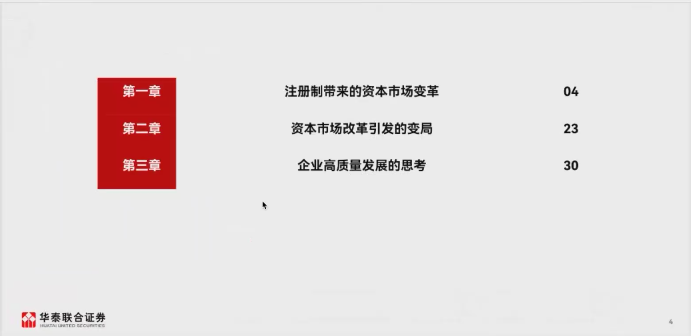 华泰联合证券投行部董事张雷总经理分享了注册制带来的变革与企业高质量发展的思考。报告分析了注册制对我国资本市场和企业发展带来的影响,指出随着注册制试点向纵深推进,“一个中心”、“两个环节”以及“三项市场化安排”,推动我国资本市场发生了凤凰涅槃般的变革:企业上市条件更有包容性,上市审核更加可预期,股票发行更加市场化。在新的资本市场形势下,A股市场出现了一系列的变局,集中体现在:卖方市场向买方市场转化;市值发生分化,头部化趋势明显;证券化红利逐步消失,上市行为更加合归理性。