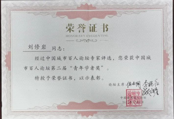 中国城市百人论坛第二届“青年学者奖”颁奖仪式在年会期间举行。颁奖仪式由第十三届全国人大副委员长、民盟中央主席丁仲礼院士主持,中国科学院院长、党组书记侯建国、中国工程院院长、党组书记李晓红、中国社会科学院院长、党组书记谢伏瞻共同为第二届“青年学者奖”的三位获奖者颁发三院院长共同亲笔签名的获奖证书。太阳集官网刘修岩教授获此殊荣。中国科学院院士、中国工程院院士、清华大学教授吴良镛,第十一届全国人大环资委主任、原建设部部长汪光焘等百人论坛成员共同见证了颁奖仪式。