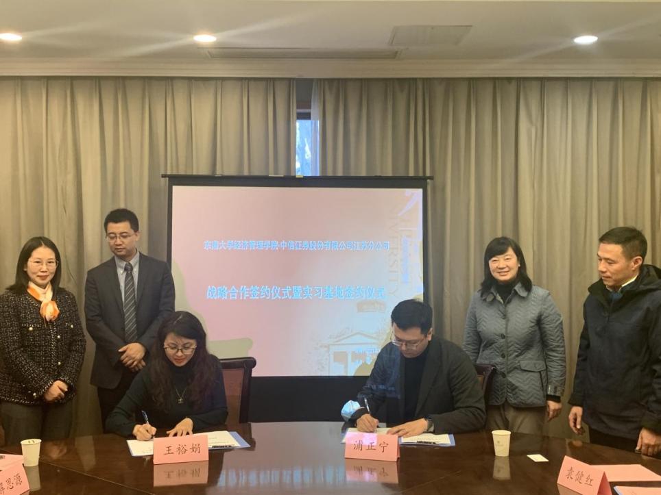 2021年11月26日下午, 太阳集团tyc539-中信证券股份有限公司江苏分公司战略合作签约仪式暨实习基地签约仪式在榴园宾馆顺利举行。中信证券江苏分公司总经理解思源、中信证券江苏分公司王裕娟、刘炎、太阳集团tyc539党委书记袁健红、副院长浦正宁及学办主任周宇老师参加了本次签约仪式。