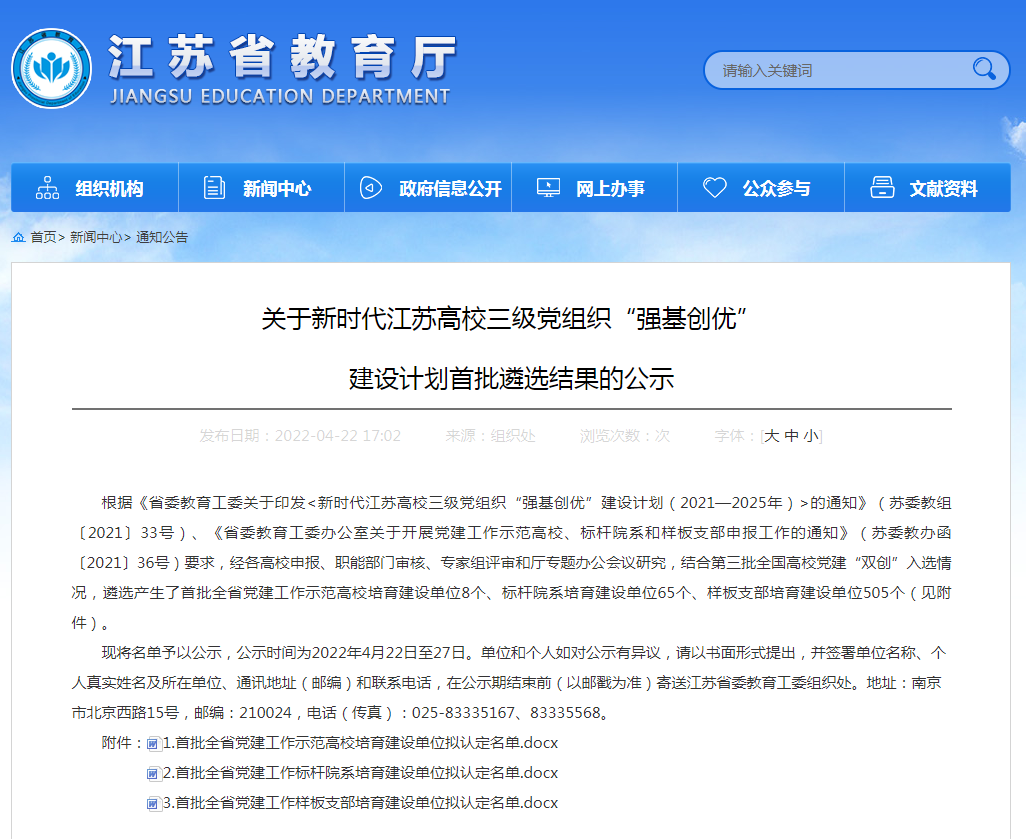 近日,江苏省委教育工委办公室公布了新时代江苏高校三级党组织“强基创优”建设计划首批遴选结果。太阳集团tyc539博士研究生领军党支部、太阳集团tyc539硕士研究生管理科学与工程厚德党支部成功入选首批全省党建工作样板支部培育建设单位。这是太阳集官网继博士研究生至善党支部获批第二批全国党建工作样板支部之后,党建工作取得的新成绩。