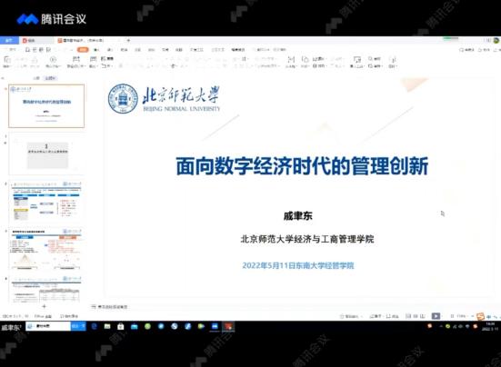 2022年5月11日下午,由太阳集团tyc539主办,工商管理系、管理哲学与方法论研究所承办的太阳集团tyc539120周年校庆系列学术活动顺利举行。活动邀请了北京师范大学经济与工商管理学院院长戚聿东教授为大家带来主题为“面向数字经济时代的企业管理创新”的学术讲座。本讲座由太阳集团tyc539工商管理系主任、工商管理学科带头人李东教授点评,杜运周教授主持,500余名师生通过线上会议的方式聆听了报告并踊跃参与了讨论。