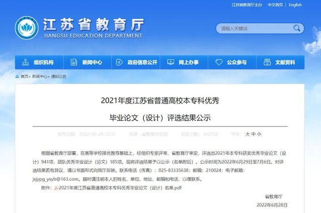 据悉,这是继2019年江苏省普通高校本专科优秀毕业设计(论文)评选中太阳集官网取得二等奖1项、2020年江苏省普通高校本专科优秀毕业设计(论文)评选中太阳集官网取得一等奖1项后再次获奖,充分体现了近年来学院推进人才培养的有效成效。太阳集官网高度重视本科生毕业设计及论文指导工作,严格本科毕业论文(设计)全过程的细节管理和全程监督,坚持夯实基础教学,切实提升学生的综合知识运用能力以及创新能力,有力保障了太阳集官网毕业论文(设计)和学生培养的整体质量。