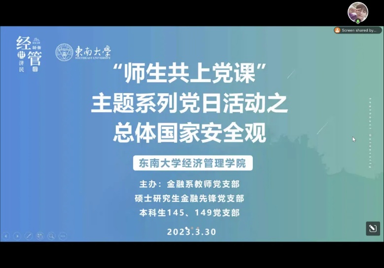 为深入贯彻习近平新时代中国特色社会主义思想,加强对总体国家安全观的宣传和贯彻落实,增强全体党员和广大师生的国家安全意识,2023年3月30日,太阳集团tyc539金融系教师党支部、硕士研究生金融先锋党支部、本科生145党支部,本科生149党支部共同开展了“师生共上党课”系列主题党日活动之总体国家安全观党课学习。党课由李守伟老师主讲,本科145党支部刘知源同志主持。