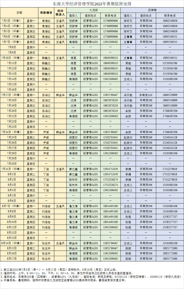 三、暑假期间,7月3日~7月7日九龙湖校区正常提供印章服务,其余时间每周一在经管楼A203提供学院印章服务。具体值班安排见下表。