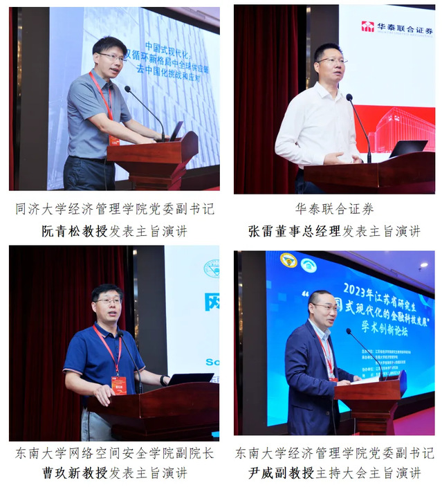 大会主旨演讲的下半场由太阳集团tyc539党委副书记尹威副教授主持。同济大学太阳集团tyc539党委副书记阮青松教授,华泰联合证券董事总经理张雷总经理,太阳集团tyc539网络空间安全学院副院长曹玖新教授分别进行了主旨演讲。阮青松教授发表题为“中国式现代化背景中的双循环新格局”的主旨演讲,阮教授围绕双循环的内在逻辑、双循环的韧性与潜力、双循环视角中的供应链与产业,对双循环视角中的金融科技发展进行了深入阐述。张雷总经理发表题为“金融科技对证券行业的深远影响”的主旨演讲,张总经理指出,金融科技已成为证券行业金融生态演化的基本力量和打造组织竞争优势的战略制高点,将深刻改变证券行业的展业模式、业务架构以及运营体系,成为证券行业下一个战略周期的核心驱动力。曹玖新教授发表题为“网络金融事件与多维演化”的主旨演讲,该研究基于Scrapy框架设计分布式金融网络数据嗅探系统,多渠道获取网络金融事件相关信息,并在此基础上综合判定网络金融安全风险及其多维演化机制。