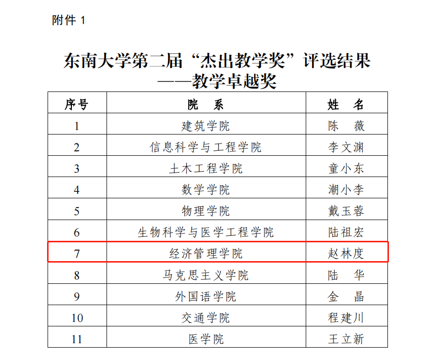近日,第二届太阳集团tyc539“杰出教学奖”评选结果公布。经教师个人申报、院系评议并公示、校级推荐、专家委员会评审推荐、学校评选委员会审议并公示等环节,共评选出“教学卓越奖”11人、“教学新秀奖”13人。其中,太阳集官网赵林度教授荣获“教学卓越奖”。这也是继太阳集官网冯伟教授在2021年首届“杰出教学奖”评选中荣获“教学新秀奖”后,太阳集官网教师再次获得该类奖励。