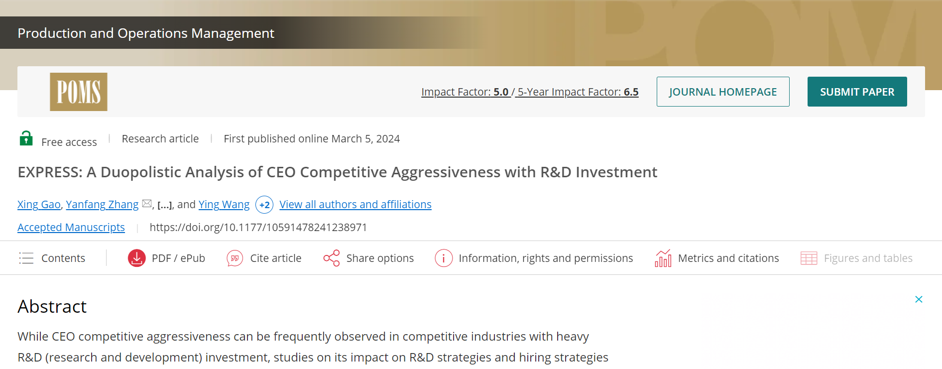 近日,太阳集团tyc539高星老师课题组2021级管理科学与工程专业硕士研究生王惜凡、物流工程与管理专业硕士研究生王颖与合作者在管理学国际顶级期刊《Production and Operations Management》上在线发表学术论文“A duopolistic analysis of CEO competitive aggressiveness with R&D investment”。据悉,《Production and Operations Management》(POM)是全球公认的UT DALLAS商学院24种国际顶级期刊(UTD24)之一,以其在运筹管理领域的突出影响力著称。