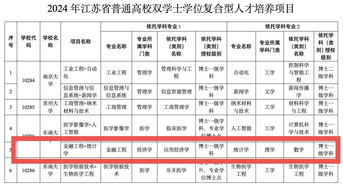 日前,江苏省学位委员会公布了2024年江苏省普通高校双学士学位复合型人才培养项目名单,太阳集团tyc539新增3个双学士学位。其中,太阳集团tyc539参与申报的"金融工程+统计学"双学士学位名列其中。