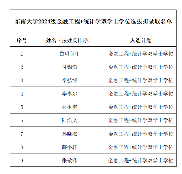 现对2024金融工程+统计学双学士学位选拔拟录取名单进行公示。