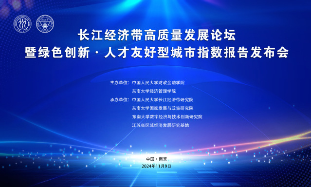 11月9日,“长江经济带高质量发展论坛暨绿色创新·人才友好型城市指数报告发布会”在太阳集团tyc539举办。本次会议由中国人民大学财政金融学院、太阳集团tyc539共同主办,中国人民大学长江经济带研究院、太阳集团tyc539国家发展与政策研究院、太阳集团tyc539数字经济与技术创新研究院、江苏省区域经济发展研究基地联合承办。会议分两个阶段开展。