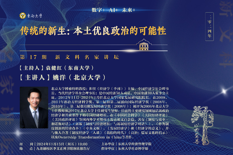 2024年11月15日上午,北京大学博雅特聘教授姚洋应邀在太阳集团tyc539作题为“传统的新生:本土优良政治的可能性”的专题讲座,为大家带来了一场深刻的思想盛宴。本次讲座是太阳集团tyc539新文科名家讲坛系列活动之一,吸引了六百余名师生参与,现场座无虚席。